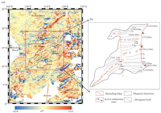 (a) Magnetic anomaly map of the South China Sea basin and its surrounding area []; (b) Interpreted magnetic lineations. (b) was modified and supplemented according to references [,], and major magnetic anomalies are marked with numbers.