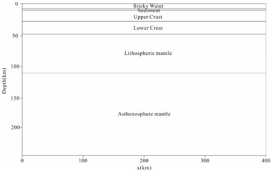 The initial model size was 400 km × 250 km (Figure 4) and was divided into six layers. The top of the model is a sticky layer, it is a weak fluid layer with a low density and low viscosity (viscosity = 1 × 1018 Pas) []. Under the above conditions and with sufficient thickness, the layer interface operates as an internal free surface []. Usually, the density of the layer corresponds to either water (1000 kg/m3) or air (1 kg/m3). Considering that in the Paleocene–Early Eocene, the continental margin of the South China Sea was mostly fluvial–lacustrine facies and Marine facies, the density of the sticky layer was set at 1000 kg/m3. The initial thickness of the sticky water layer was 10 km. Below the sticky layer, from top to bottom, are the sediment, upper crust, lower crust, lithospheric mantle, and asthenosphere mantle. Zheng et al. (2022) [] calculated the thickness of the crustal lithosphere, and the normal crust of South China is 30–32 km, the uniform thinning zone of the shelf is about 24–28 km, and the crustal stretching coefficient is less than 1.2 [], and referring to the cross section of Figure 2, it is assumed that the thickness of the crust before the stretching is about 38 km. Therefore, the thickness of the sediment layer was 2 km, the upper crust was 18 km, the lower crust was 20 km, and the lithospheric mantle was 65 km. The rheological flow law of sedimentary layer was set according to wet quartz [], the parameters of the rheological flow law of the upper crust were referred to the reference [,], the rheological flow law parameters of lower crust were set according to plagioclase An75, and the lithospheric mantle and asthenosphere mantle are dry peridotite []. Other parameters of the model were set according to reference [,,,] and actual geological conditions (Table 1).