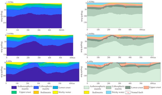 The full spreading rates of the ESB and the SWSB were 20–80 mm/a and 35–50 mm/a, respectively. The spreading velocity of the ESB was about 70 mm/a during 32–29 Ma. At 29–26 Ma, the spreading rate was about 25 mm/a. The spreading rate remained at about 70 mm/a before the southward transition of 23.6 Ma, and then the spreading rate varied from 50 mm/a to 35 mm/a from 15.5 Ma, which was similar between the ESB and the NWSB [,]. The SWSB began spreading around 23.6 Ma and stopped spreading around 16 Ma. Briais et al. (1993) [] suggested an average expansion rate of 40 mm/a [], while Barckhausen et al. (2014) [] proposed a high spreading rate (76–80 mm/a) for the SCS during the final spreading phase []. The anomalously thin crust of the SWSB supported a slower spreading rate (half-spreading rate 12.6 mm/a) []. If the seafloor spreading rate was close to the extension rate, then the extension rate of the eastern margin may have been significantly faster than that of the western margin. To qualitatively study the magnitude of the extension rate, based on the above data, three sets of models with different extension rates were designed. The constant velocity applied on both sides of the model was half of the extension velocity. The half-extension rates of models 1, 2, and 3 were 30 mm/a, 20 mm/a, and 12.5 mm/a, respectively.