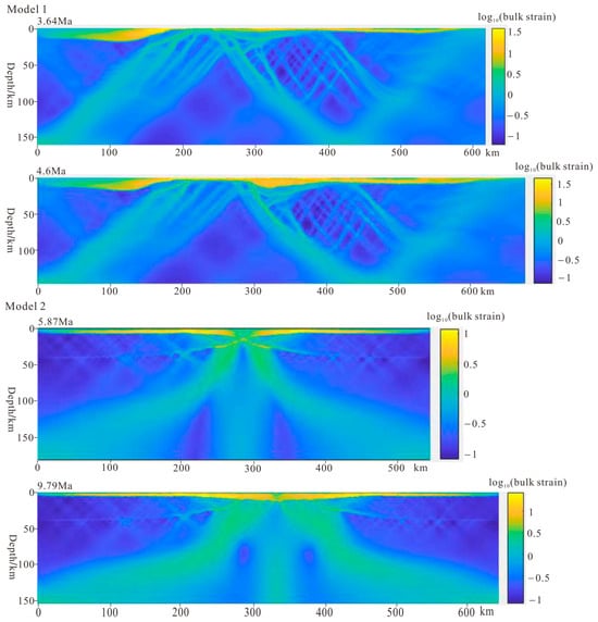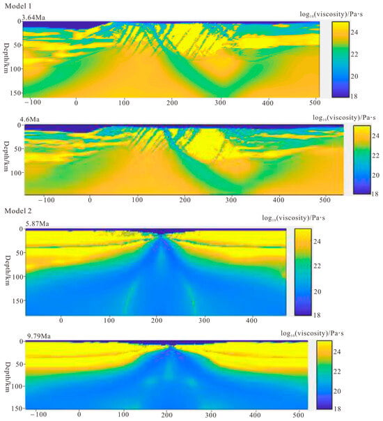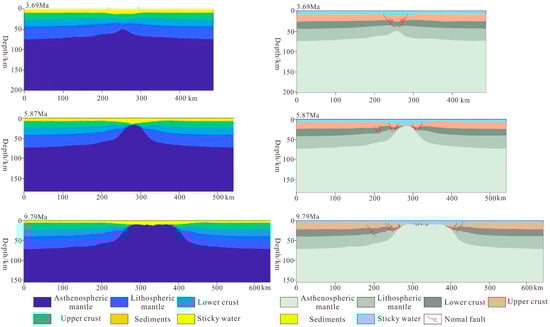We mainly discussed the operation results of three groups of different extensional rate models, their evolution process, and the time of rupture. The original simulation results of the three models (Figure 5, Figure 6 and Figure 7) were interpreted, and the major faults were marked. In addition, the bulk strain (Figure 8) and viscosity field (Figure 9) changes in models 1 and 2 were compared.
