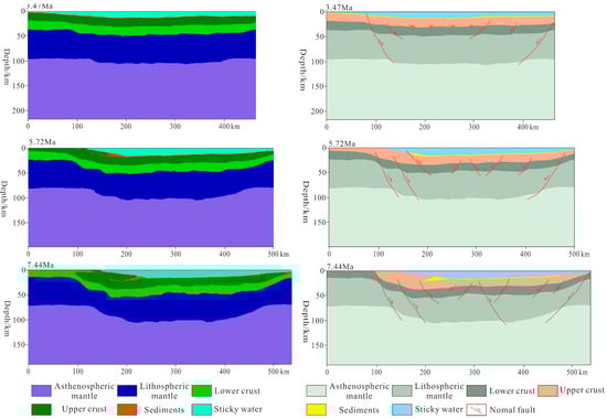 In general, the simulation results of Model 1 had a high degree of fitting with profile AA’ in Figure 2. The AA’ profile exhibits asymmetric spreading, with the size and number of fractures on the northern margin being greater than on the southern. The crustal thickness of the northern margin is slightly greater than that of the southern margin, while the thickness of the lithospheric mantle is smaller in the north than in the south. The results obtained from the simulation of Model 1 are similar to the actual profile, both in terms of the distribution of fractures and the morphology of the crust and lithospheric mantle. Model 1 can initially correspond to the spreading patterns of the NWSB and the ESB.