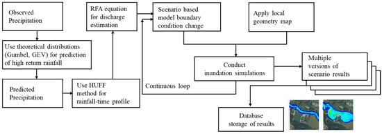 Using the estimated variables, the Gumbel and GEV distribution suitable for the rainfall data from the rainfall observation station was constructed, and the rainfall in the designated return period for each scenario was calculated by calculating the inverse function of the cumulative probability of the Gumbel and GEV distribution. Then, using the rainfall from the return periods, the empirical rational flow formula for discharge was utilized to estimate the discharge in the target area. Then the discharge values were used as the scenario boundary conditions for the introduced two-dimensional model. This calculation of inundation elevation through simulation would be based on various scenario-based model boundary condition changes to conduct multiple versions of simulating scenarios. The database storage of results was undertaken using the results of the two-dimensional flow model, so for the upstream water depth or the target point of interest, additional two-dimensional flow modeling would be less necessary since modeling was pre-conducted.
