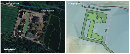 The field target area of study is the Gampo Sewage Treatment Plant, which is located near Gyeongju City as the first sewage treatment plant built as a pilot project for sewerage advancement. There is a small river to the north of the sewage treatment plant, so areas where flooding may occur in the event of flooding are analyzed. The buildings and areas that would be later used for the inundation graph creation are depicted in Figure 2.