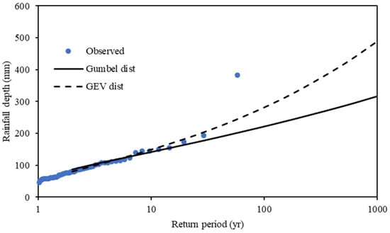 Another point for discussion is the uncertainty of using theoretical statistical distributions for extreme floods. Figure 3 shows an underestimation of rainfall depth compared to the largest recorded rainfall, which is the return year of 58, but this type of discrepancy is also shown in previous research []. This could be reasonable, but the fact remains that high return periods have uncertainty in estimation and must be considered in using theoretical statistical distributions. Since extreme events are by definition rare, it is difficult to reliably estimate extreme quantiles from the site data, which frequently comes from limited record lengths. Regional frequency analysis could be conducted to deal with this problem, but this was out of the scope of this research.