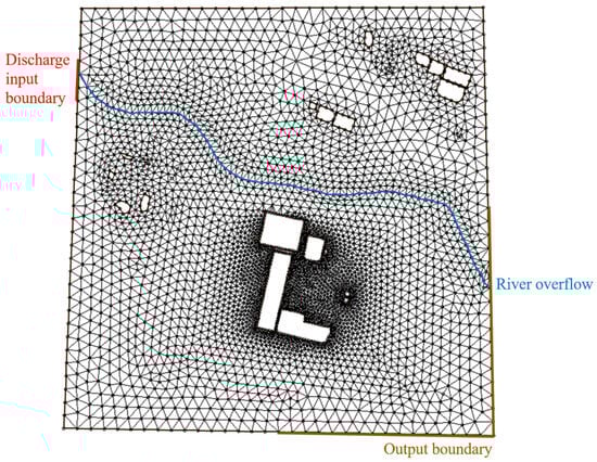 The discharge boundary conditions for the two-dimensional flow model for inundation analysis used the time-discharge values from the estimated flow rate. For the river overflow conditions for the water surface elevation, the conventional power function equation were applied to the ungauged small river which was located in the north part of the target area shown in Figure 5, using similar C values from stage-discharge equations developed in a nearby city since actual measured stage data at the river in the model was not available. Then for the flow model, a triangular mesh was constructed using topographical data from the site, which consisted of 6684 elements and 3558 nodes shown in Figure 5.