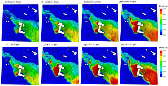 Using the flow rates from the return period scenarios, the two-dimensional flow simulation was conducted through several cases of scenarios. The results of the estimated depth were then stored in the inundation graph. Originally, the results of running the two-dimensional flow model in various cases would have looked similar to those in Figure 6, which depicts all the scenarios with 50–200-year flood frequency based on the theoretical functions of Gumbel and GEV. Although this is the typical result for two-dimensional simulation, the target area of interest may be located in a specific area of the constructed mesh.