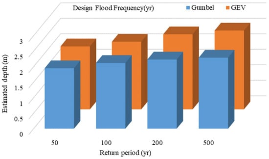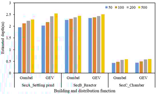 Another possible way to apply this developed scenario method is by targeting the simulation results to specific areas in the site shown in Figure 9. This would be necessary if the target region included structures of interest; the sewage plant’s settling pond, reactor, and chamber were among the buildings that made up the application’s present target site. The various flood scenarios can demonstrate each urban building’s vulnerability and be used for additional assessment. The graph also shows the difference in results when using different distribution functions up to 11 percent of estimated depth, which depicts the importance of using various scenarios for extreme events such as the return period of 500 years. Later, these results could lead to Intensity–Duration–Frequency (IDF) curve creation and further analysis of the difference between the extreme value distributions using other theoretical distributions such as Log-Pearson III.