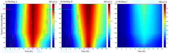 where HR is the flood hazard rating index at point i, is the water depth at point i, and is the velocity magnitude of the water at point i. The utilized application flow model is a depth-averaged model, and the flow velocity is two-dimensional so there is a vector for the x-direction and y-direction. The velocity magnitude will then be the square root of the sum of the squares of velocities in the x and y directions. The result of the hazard rating is shown in Figure 10, with the scenario return period for the y-axis and time used in Figure 8 for the unsteady simulation as the x-axis. The time used is the same time for the unsteady simulation that is depicted in Figure 8 in a scenario, which uses input from the estimated flow rate in Figure 4. As water depths are calculated during the time span, the flow velocity is also calculated and used in creating the hazard matrix. If the HR is less than 0.75, floodwater would cause minimal damage to individuals; if it is more than 2.5, there is a high risk of damage [,]. The safety in flood situations would be calculated using these thresholds of 2.5 and 0.75 for classification. The results were shown in a matrix form for each building, to find the values of the flood hazard rating index for scenarios easily. The created matrix is shown below with application from the scenarios. Buildings A and B which are the settling pond and reactors showed high flood hazard rating values in certain scenarios, while building C showed low values, which would be considered relatively safe.