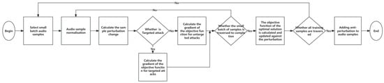 In the iterative greedy approach, the primary aim is to minimize the objective function of a batch of samples from the dataset to calculate the generalizability against perturbations. An iterative greedy-based algorithmic process is designed to generate an adversarial perturbation algorithm for acoustic generalization. The symbols used in the algorithm are described in detail, followed by an explanation and analysis of the specific role of each step. The following section elaborates on the iterative optimization process, including the solution steps and schemes of the optimization problem. Additionally, a new objective function is designed to implement an iterative greedy-based adversarial perturbation generation method for acoustic generality. Relevant experimental analyses are carried out under target-attack and targetless-attack scenarios.