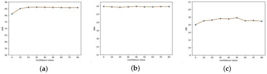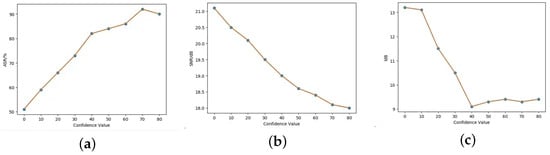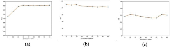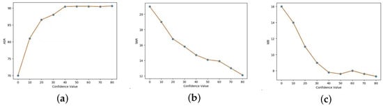 Experimental results of the ENVnet-V2 model at different confidence levels. (a) Effect of confidence value on ASR; (b) effect of confidence value on SNR; (c) effect of confidence value on .