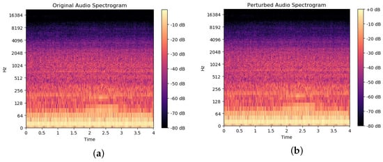 Comparison of original and added adversarial perturbation audio sample spectrograms. (a) Original spectrogram of the audio sample; (b) adversarial spectrogram of the audio sample.