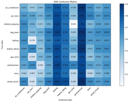 For the problem of large differences in the number of samples in different datasets, there may be cases where the number of samples in the dataset is small, therefore, under the condition of taking a single sample for each category in the UrbanSound8k dataset, the IG-UAP algorithm was used to test and experimentally analyze the target attack on the 1DCNN Gamma model, and the experimental hyperparameters were as shown in Table 6, in which horizontal coordinates 0 to 9 represent the categories in the UranSound8k dataset, respectively, as follows: air_conditioner, car_horn, children_playing, dog_bark, drilling, engine_idling, gun_shot, jackhammer, siren, and street_music. The ASR mixing matrix of the experimental results is shown in Figure 9.
