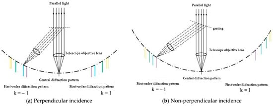 Subsequently, when the grating plane is rotated from a state of perpendicular incidence with an angle (where is the angle of parallel light incidence), the diffraction angle is defined as the angle between the diffracted light and the 0th-order spectrum. According to grating diffraction theory, the formula for non-perpendicular incidence is as follows:
