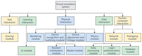 The diversity of experimental phenomena can be attributed to variations in parameters within the physics formulas. Therefore, the system is founded on the principles of experimental physics, incorporating the latest virtual simulation technologies []. Multiple experiments within this virtual simulation system adhere to a generic design architecture. Based on the interactive nature of virtual reality, the system is divided into five subsystems, as illustrated in Figure 3: Task Interaction, Learning Interaction, Physical Interaction, Data Interaction, and Human–Computer Interaction.