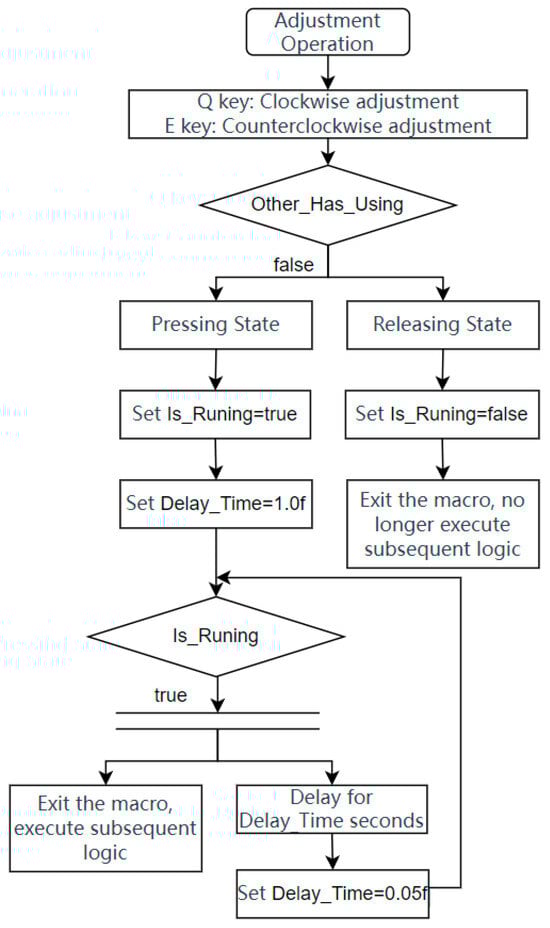 As shown in Figure 4, when invoking the macro, it is necessary to first check whether other keys are invoking the macro. The execution continues only when “Other_Has_Using == false”. When the key status is released, we set “Is_Runing == false” to indicate that the macro is not running. After exiting the macro, subsequent logic is not executed. When the key status is pressed, we set “Is_Runing == true” to indicate that the macro is running. At this point, the first delay time ‘Delay_Time’ is set to 1 s. Then, the initial judgment of ‘Is_Runing‘ is executed. When “Is_Runing == true”, we exit the macro concurrently, execute subsequent logic, and delay for ‘Delay_Time’ time. The first delay is 1 s, and, during this period, releasing the key results in a single adjustment. If the pressing time exceeds 1 s, it becomes a continuous adjustment. Under continuous adjustment, we set a new delay time ‘Delay_Time’ to 0.05 s. This allows the continuous checking of the ‘Is_Runing’ state and the execution of subsequent logic.