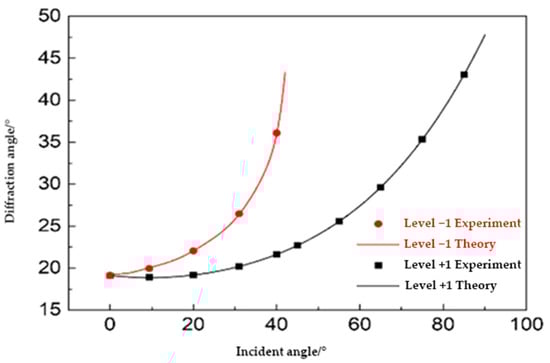 Finally, when the incident light and diffracted light are on the same side, for green light with a known wavelength incident at an angle on the grating, satisfying Formula (2), it is evident that the diffraction angle varies with the change in . Through mathematical methods, it is not difficult to prove that when , has a minimum value, known as the minimum diffraction angle (). Importantly, the minimum diffraction angle occurs only when the incident and diffracted light are on the same side. Therefore, substituting into the formula,