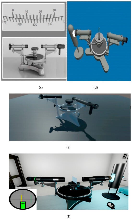 Figure 9. Comparison of virtual simulation effects. (a) Spectrometer instrument based on Unity 3D []. (b) Virtual spectrometer instrument structure []. (c) Spectrometer adjustment interface []. (d) Diffraction experiment based on OpenGL []. (e) Spectrometer based on Unity 3D []. (f) Spectrometer experiment based on Unreal Engine 5.