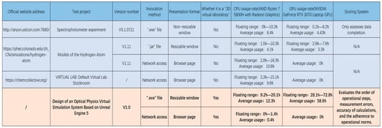 - Lower performance requirements. As this system is a 3D virtual simulation experiment, the real-time rendering of scene models and lighting effects consumes more system resources compared to 2D experiments. Therefore, the “.exe” program of this system is not included in the performance comparison. It only demonstrates that web-based access using Unreal Engine 5’s pixel streaming technology has lower requirements for computer performance. By delving into the well-known virtual simulation platforms such as phET and Chem Collective, the performance superiority of the system is compared based on CPU usage (AMD Ryzen 7 5800H with Radeon Graphics) and GPU usage (NVIDIA GeForce RTX 3070 Laptop GPU), as shown in Figure 10. The web-based CPU average usage of Unreal Engine 5 is only 0.4%, reducing the CPU usage by 90.24% to 96.23% compared to the other three platforms, with an average saving of 94.76%. Additionally, the GPU usage for network access in this system is 0%, saving GPU resources compared to non-network-access simulations.