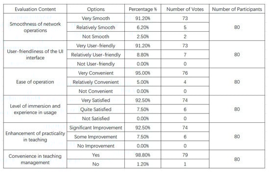 - Positive reputation. During the trial phase after the completion of system development, in-depth experiences were provided to professionals and students from various disciplines. A comprehensive survey was conducted, resulting in the collection and analysis of 80 survey reports, as shown in Figure 11. By analyzing the data in the figure, it is evident that each evaluation category received a positive rating exceeding 90%. The system has gained an excellent reputation in real-world environments.