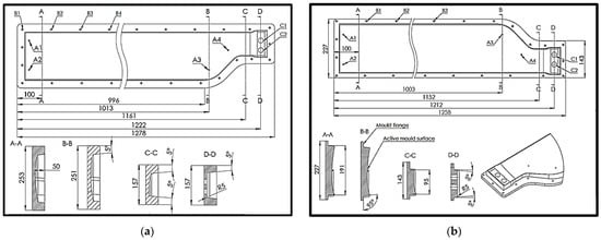 Figure 7b) of the blade were manufactured by the thermoplastic extrusion process, this time being positive shapes of the mould section. The active surface of the mould is sanded with the help of these and abrasive paper of different grits. The grits of the abrasive paper used are in ascending order as follows: 120, 180, 240, 320, 480, 600, and 1000 (note that the sanding for grits of 480 and above was conducted in the wet condition).