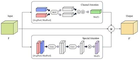where represents the function, is a multilayer perceptual machine, and denote tie pooling and maximum pooling, stands for convolution, stands for connection, and and represent the outputs of channel attention and spatial attention, respectively.