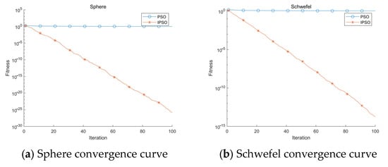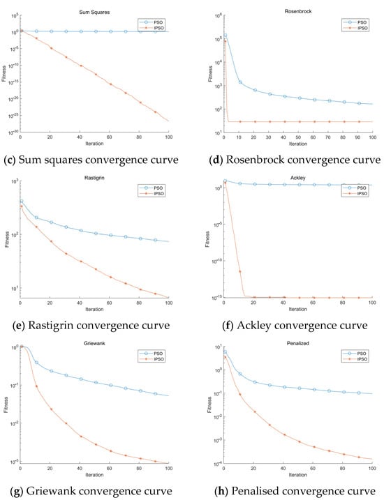 To verify the superiority of the IPSO algorithm, the PSO and IPSO algorithms were executed on eight benchmark test functions. The population size for the PSO and IPSO algorithms was set to 50, the number of iterations was set to 100, the dimensionality was set to 30, and the number of independent runs was set to 20. As shown in Table 4, the minima, maxima, averages, and standard deviations obtained by the IPSO algorithm were better than those obtained by the PSO algorithm and were closer to the global optimum. Figure 8 compares the convergence curves of the PSO and IPSO algorithms, and one can draw the following conclusions: the IPSO algorithm performs better in terms of convergence accuracy, and it enables the particles to gather more stably in the vicinity of the global optimum, therefore improving the ability of the PSO algorithm to overcome local extreme values.