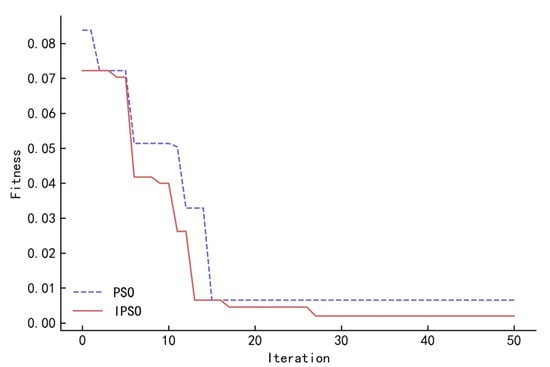 The results of IPSO and traditional PSO optimisation searches were compared. The number of iterations of the optimisation algorithm was set to 50, and the population was set to 30. The variation of fitness values during the iteration process of the PSO and IPSO algorithms is shown in Figure 9.