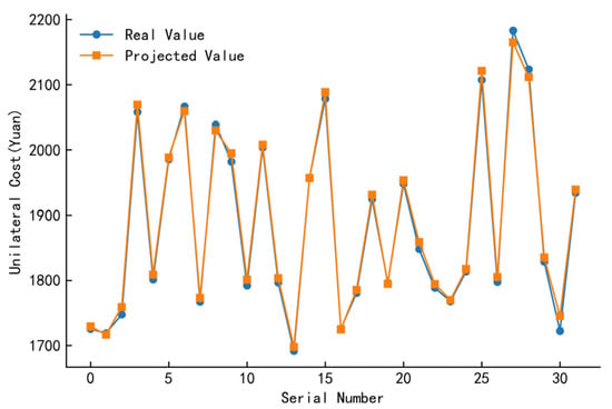 Figure 10 compares the predicted and real value curves of the proposed model on the test set for the unilateral cost of construction projects. The predicted and real value curves fit well together, which shows that the model has good prediction performance for the unilateral cost.