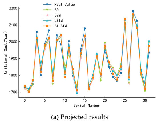 Table 7 shows the results of the comparison of each single model on the five evaluation indicators. For the construction cost data, the average errors of LSTM and BiLSTM with time series capturing capability are relatively small, and the MAE, RMSE, and MAPE of BiLSTM are reduced by 2.536, 3.107, and 0.142%, respectively, compared with those of LSTM, which verifies the superiority of the BiLSTM bi-directional processing mechanism in capturing the inter-temporal interactions of the data.