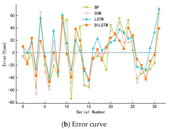 To verify the superiority of BiLSTM in capturing the interactions between data tensors, BiLSTM is compared with the traditional benchmark models BP, SVM, and LSTM. The prediction results and errors are shown in Figure 11. The prediction results demonstrate that BiLSTM has the best fit to the true values, and the overall error variation of BiLSTM is relatively smooth, as seen from the error curves.