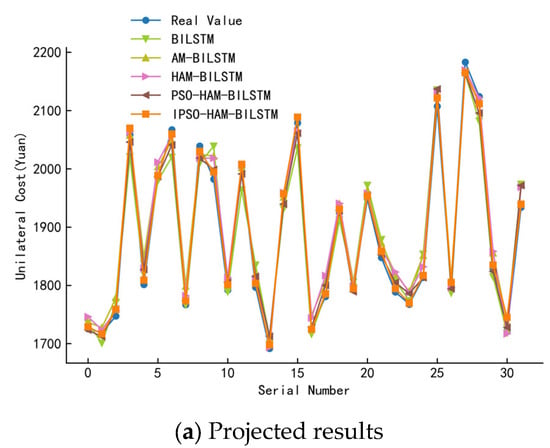Table 8 shows the comparison results of the models on the five evaluation metrics, the mean percentage error of the five models is positive, avoiding the serious consequences of underestimating the cost, and all the other error metrics of HAM-BiLSTM after optimising the hyperparameters by IPSO are significantly reduced. In particular, the average absolute error of HAM-BiLSTM is reduced by 6.711 and 4.252%, the RMSE is reduced by 7.757 and 3.670%, and the average absolute percentage error is reduced by 0.325 and 0.237%, respectively. This further demonstrates the effectiveness of HAM in capturing the interactions between the features and enhancing the feature extraction capability of the model. The average absolute error of HAM-BiLSTM after IPSO optimisation of hyperparameters is reduced by 8.560 and 6.236%, the RMSE is reduced by 10.436 and 7.658%, and the average absolute percentage error is reduced by 0.463 and 0.324%, in comparison with those of HAM-BiLSTM and AM-BiLSTM after PSO of the hyperparameters, indicating that the improved PSO algorithm has a better search capability, which can better overcome the problem of falling into local optimal solutions and then find a more comprehensive search of the hyperparameter space to find a better combination. Thus, the improved particle swarm optimisation algorithm has stronger search capability and can better overcome the problem of falling into local optima, thus searching the hyperparameter space more comprehensively and finding better hyperparameter combinations.