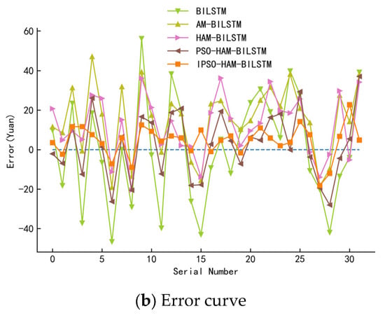 To validate the effectiveness of the model components further, the model was compared with BiLSTM, AM-BiLSTM, HAM-BiLSTM, and PSO-HAM-BiLSTM. The prediction results and error comparisons are shown in Figure 12.