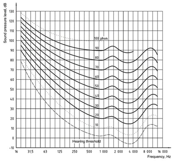 Aerodynamic noise is characterized by pressure waves with different amplitudes and frequencies and is spread using air as a means of transport. Given the same amplitude, noise at higher frequencies is perceived as more acute, whereas that at lower frequencies is deeper. The entire range of audible frequencies extends from approximately 20 Hz to 20 kHz, even though sounds are better perceived by the human ear at a frequency of approximately 3 kHz. This means that a sound wave with a given amplitude is associated with the maximum auditory sensation (phon) if it is emitted at 3 kHz, whereas the sensation is inferior at higher or lower frequencies, as is clear from the normal equal-loudness contours (Figure 1) from ISO 226 []. Given the same frequency, a wave with a higher amplitude has a higher level of auditory intensity; consequently, it will be perceived as louder, and vice versa.