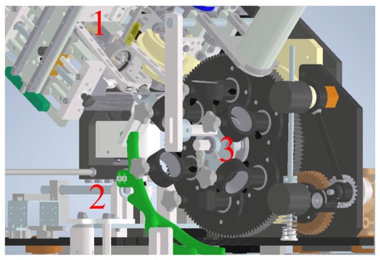 Finally, the distribution phase occurs when the cylinders are in the bottom part of the wheel and a bottle is placed exactly beneath it (this synchronization is always guaranteed). At this moment, the central gray nozzle (No. 3 in Figure 2) generates an air shot that shoots the cap onto the neck of the bottle.