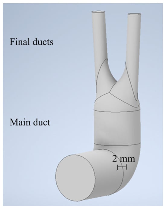 In addition to the reference model (Figure 4), eight other models were created by increasing or decreasing the length or diameter of the final ducts or main duct one at a time. In Table 1, each model is described and compared with the actual model, which is the reference model (R).