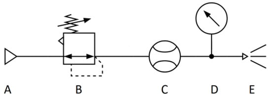 The pneumatic scheme of the test bench is illustrated in Figure 5. The pressure regulator (B) was connected to the compressed-air supply line (A). A digital flow sensor (C) (SFAB full scale of 200 L/min, Festo, Esslingen am Neckar, Germany,) was inserted downstream of the pressure regulator, and a pressure gauge (D) (Alame Acier, full scale of 1 bar, Blondelle, Panimplex NV, Veurne, Belgium) was located just before the nozzle (E) to measure the inlet pressure at the nozzle as accurately as possible. Each nozzle (E) was tested with its final ducts in direct contact with the atmosphere, as in the normal operation. Each test was repeated five times.