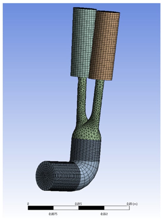 The software ANSYS Fluent 2022/R2 was used to implement the model for conducting the CFD analysis on the nozzle presenting the higher air consumption. The geometry of the fluid domain was the same as that presented in Figure 4, but two additional cylinders were added above each final duct to simulate and calculate the flow characteristics in the area just outside the nozzle considered for the analysis. This was because the noise was generated in that region; hence, the jet power and range should be estimated for that region. The additional cylinders were 20 mm long and 7 mm in diameter. These dimensions were defined such that the flow could fully develop along the width and length without boundary constraints. The final mesh of the fluid domain for the CFD analysis of the actual model is shown in Figure 6.
