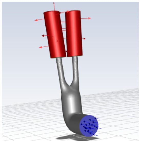 The boundary conditions were the same for all the models and were set as follows: The mass flow inlet on the inflow surface of the main duct (blue arrows in Figure 7) was equal to the experimental inlet at the supply pressure of 0.5 bar. The pressure outlet at the boundary surfaces of the extra cylinders was equal to the room-gauge pressure, which was 0 bar (red arrows in Figure 7). Impervious walls were used on all the other surfaces, with a null roughness height, because it has been verified that its relevance is negligible (a difference of 500 μm in the roughness height causes a variation of just 7 m/s in the peak speed).