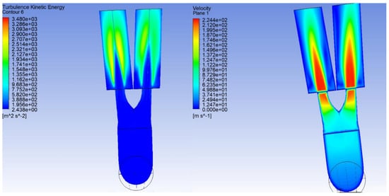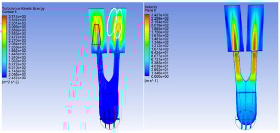 In Figure 8, the results obtained with the reference model (R) by setting a mass flow inlet of 0.00241 kg/s, equal to the experimental mass flow inlet at the supply pressure of 0.5 bar (Table 2), are presented; the turbulence field is shown on the left and the velocity field is shown on the right.