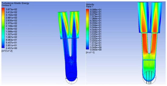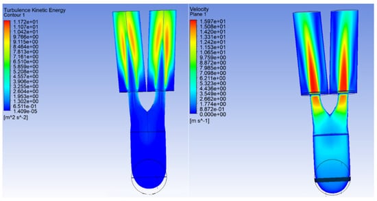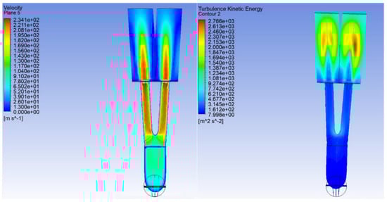 The velocity field represents the magnitude of the instantaneous velocity at each point measured in meters per second (m/s), while the “turbulent kinetic energy” (k) [] is a parameter that characterizes the turbulence of the flow and is evaluated as the average kinetic energy per unit mass (m2/s2) associated with turbulent vortices.