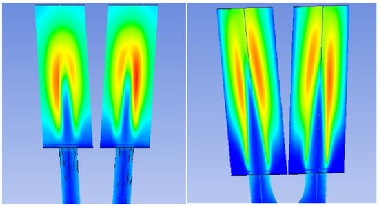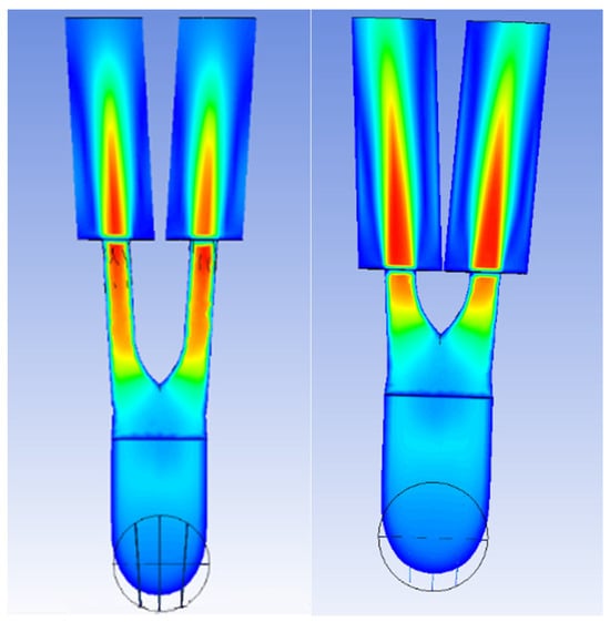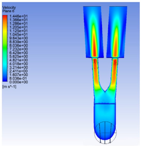 All the numerical results are presented in Table 4. The peak outlet velocity was evaluated based on the velocity field by determining the highest value. The peaks of the outlet velocities of M3 and M6 agreed with the experimental results obtained under the same conditions (Table 2).
