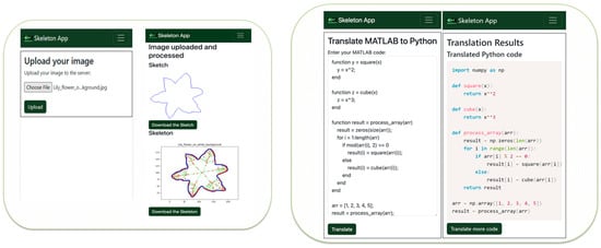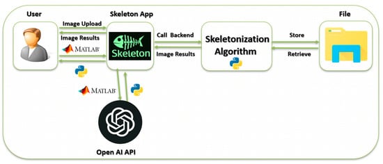 The translation, presented in Figure 4 (right), is performed by the OpenAI API and ChatGPT-4 models (RQ3, RQ4). As can be seen from Figure 4, the Skeleton app is responsive, simple, and user-friendly. The only action the user needs to take is to upload/download the images to obtain sketches and the skeleton. The Skeleton app architecture can be observed in Figure 5. It is novice, unique, and can scale quickly if deployed live.