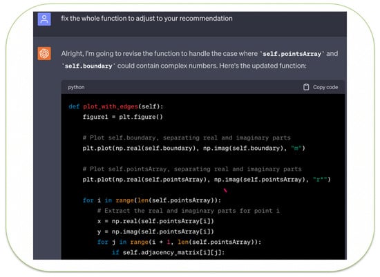 The application of Large Language Models (LLMs), such as ChatGPT, across various fields has been the subject of extensive exploration in recent studies. These models have demonstrated promising results in diverse areas, including engineering, education, and science, thereby showcasing their versatility and potential. In engineering, Koziolek et al. [] investigated the use of ChatGPT for generating control logic for programmable logic controllers and distributed control systems, finding that ChatGPT could generate code as accurately as humans. Similarly, Ran Li et al. [] leveraged ChatGPT for power system programming tasks, demonstrating that it could generate code as efficiently as human experts. Meng-Lin Tsai et al. [] explored the use of LLMs in chemical engineering education, finding that LLMs could generate core course problem models that were more engaging and effective than traditional problem models. This suggests that LLMs, such as ChatGPT, could play a crucial role in enhancing the learning experience in engineering education. In the context of scientific coding, Cory Merow et al. [] found that AI chatbots could boost scientific coding by assisting scientists in writing code more quickly and accurately. Yulia Kumar et al. [] proposed a comprehensive testing framework for AI linguistic systems using ChatGPT (version 4) as an AI pair programmer. They found that ChatGPT could generate test cases more effectively than human experts, indicating its potential in the M-to-PY conversion for complex projects such as image skeletonization. This conversion process could potentially be automated using the OpenAI API. Other studies have focused on the potential impact of AI language models, such as ChatGPT, on various professions. Brett Maurer [] discussed how AI chatbots, such as ChatGPT, could revolutionize the geotechnical engineering profession by automating tasks, providing advice, and answering questions. In a different vein, Nuno Crokidakis et al. [] used ChatGPT to chat about complex systems and found that it could generate informative and engaging responses. Sasha Nikolic et al. [] conducted a multidisciplinary and multi-institutional benchmark and analysis of ChatGPT to investigate assessment integrity in engineering education. These studies found that ChatGPT could generate code as accurately as code created by software developers, making it hard to distinguish between the two.