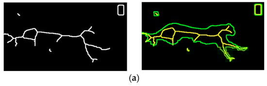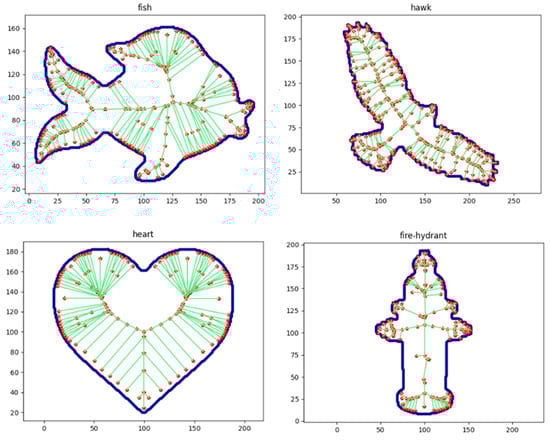 This study focused on the MATLAB one-step compact skeletonization code developed by Kathryn Leonard et al. []. Once the team succeeded in making the original code work, the following results were obtained: see Figure 1.