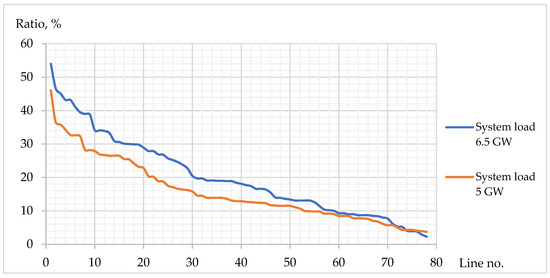 The three most effective parameters determined during this study are used in the developed methodology for ranking electric transmission lines: Sn—design capacity of the power line, MVA; LF (line flow)—power flow in an electric transmission line, MVA, and the ratio of LF/Sn.
