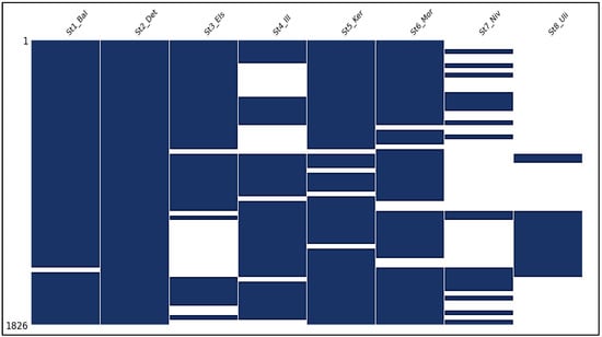The total number of days accounted for in this study is 1826. As mentioned earlier, these reference stations consist of various discontinuous missing patterns within the study period (1 January 2015–31 December 2019). The following heatmap (Figure 3) depicts the missing patterns in the data of eight reference stations and Table 1 summarizes percentages.