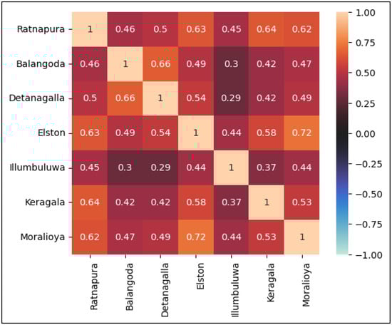 The correlation between the rainfall values of different stations may be either linear or nonlinear. Therefore, to capture any type of correlations, the Spearman correlation coefficients were calculated (refer to Figure 4).