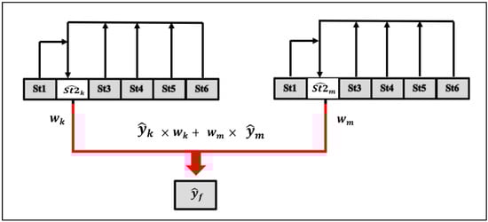 The structure of the performed hybrid model with MLP and spatial kriging can be depicted as in Figure 5. In the notation, and refers to the spatial kriging and the MLP estimates corresponding to the missing rainfall value of the station, for instance, St2 (there are situations where the rainfall values of more than one station are missing on the same day).