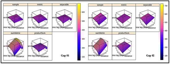 In fitting the spatiotemporal model for the rainfall data, the empirical variogram surface (or sample variogram) based on space and time is computed and used as inputs for fitting different models: metric, separable, sum metric, and product sum models. Out of them, the best fitting model can be selected, comparing with the surface of the empirical variogram. When considering Missing Gap 01 in Figure 7, the metric-type variogram shows the most similar surface shape with respect to distance and time lags as that of the original sample. Nevertheless, in Missing Gap 02, the product sum variogram is more similar to the pattern of the actual sample. Likewise, in 11 gaps, the optimal variogram type deferred with the missing pattern of the data.