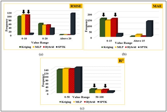 Figure 9 illustrates that kriging produced most cases within the lowest value range of MAE and within the highest value range of R2, whereas the MLP gained the majority of cases within the lowest value range of RMSE. In all these occurrences, the hybrid model has shown approximately the same performance as the optimal model.